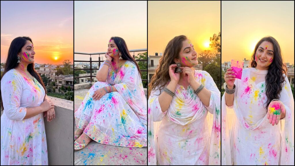 Show Prompt Pose: Standing in a lively, celebratory stance during a Holi festival moment. Right arm raised forward mid-throw of colored powder. Left hand touching hair casually. Wide joyful smile, carefree energy. Camera Angle: Eye-level, medium close-up, shallow depth of field. Outfit: Light kurta splashed with Holi colors, sunglasses, bangles, earrings. Background: Outdoor Holi scene