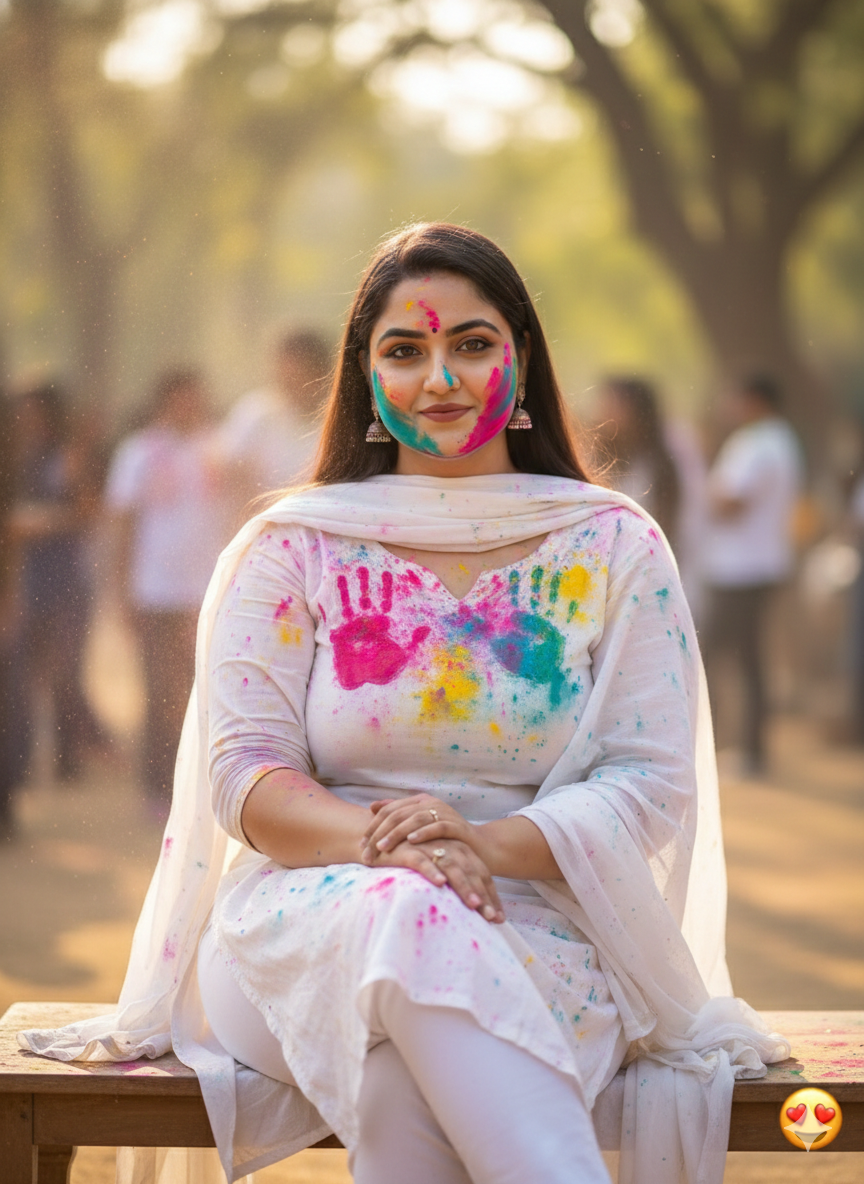 Prompt Image 2- Scene description: A woman sitting outdoors during a Holi festival celebration, her white traditional kurta and dupatta covered in vibrant splashes of colored powder. Red handprint marks visible on her upper chest, colored powder floating in the air around her. She is seated with one leg folded over the other, hands resting gently on her knee, smiling softly at the camera. Festive crowd and trees in the background with soft bokeh, warm festive Indian Holi atmosphere, dust and color particles suspended in the air. Face / ethnicity / age range: Face exactly as per the attached reference image, South Asian woman, early 20s to early 30s age range, soft feminine facial features, expressive eyes, natural smile. Camera + lens: Medium portrait shot, eye-level angle, 50mm prime lens, shallow depth of field, cinematic framing. Lighting: Natural warm daylight, soft diffused sunlight, gentle rim light from behind highlighting hair and floating color particles, balanced exposure on face and outfit. Quality tags: Ultra-detailed, photorealistic, high resolution, sharp focus on subject, creamy bokeh background, cinematic color grading, professional photography, 8K quality, natural skin texture. Negative prompt: Low resolution, blurry, out of focus, distorted face, extra fingers, extra hands, bad anatomy, deformed body, harsh shadows, overexposed highlights, underexposed image, artificial skin, plastic texture, unrealistic colors, cartoon, anime, CGI look, watermark, text, logo, cropped face, poorly framed composition
