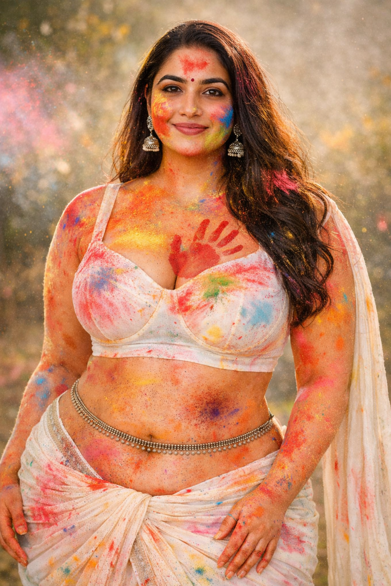 { “scene_description”: “A young woman celebrating Holi outdoors, standing confidently while covered in vibrant colored powder, wearing traditional Indian attire. The scene captures a festive atmosphere with colored dust floating in warm sunlight.”, “characters”: [ { “name”: “Unknown”, “age”: “Mid-20s to early 30s”, “gender”: “Female”, “ethnicity”: “South Asian”, “skin_tone”: “Medium warm brown”, “hair”: { “style”: “Long, loose, wavy hair swept over one shoulder”, “color”: “Dark brown” }, “clothing”: { “head”: “Red bindi centered on forehead”, “torso”: “White fitted blouse/choli with thin straps, heavily stained with multicolored powder”, “legs”: “White sari draped around waist, tied in front with visible pleats”, “feet”: “Not visible in frame”, “materials”: [“Cotton”, “Lightweight fabric”, “Soft woven textile”] }, “pose”: “Standing upright facing camera, shoulders relaxed, hands resting near hips with slight forward posture”, “facial_expression”: “Soft confident smile, relaxed eyes looking directly at camera”, “accessories”: [ “Large silver jhumka earrings”, “Silver waist chain (kamarband)”, “Small nose stud” ], “held_objects”: [], “position_in_scene”: “Foreground, center”, “emotions”: [“Joy”, “Confidence”, “Calm”, “Festive spirit”] } ], “environment”: { “setting”: “Outdoor natural setting, possibly a garden or open field during Holi festival”, “background_elements”: [ “Soft blurred greenery”, “Floating colored powder particles in air”, “Warm golden haze” ], “architectural_features”: [], “weather”: “Clear, warm daylight”, “lighting”: { “type”: “Natural”, “sources”: [“Sunlight from upper side creating soft rim lighting”], “shadows”: “Soft and diffused”, “reflections”: “No strong reflections visible” }, “atmosphere”: “Festive, colorful dust suspended in air, warm and celebratory” }, “objects”: [ { “name”: “Colored powder (gulal)”, “type”: “Festival pigment powder”, “position”: “Foreground and midground, dispersed across subject and air”, “appearance”: “Bright red, yellow, blue, green, and pink powder smeared and splashed across skin and clothing”, “materials”: [“Fine powder pigment”], “interaction”: “Yes, covering the woman’s face, torso, arms, and clothing” }, { “name”: “Red handprint mark”, “type”: “Powder imprint”, “position”: “Foreground, center chest area”, “appearance”: “Distinct red palm and finger marks clearly visible”, “materials”: [“Colored powder pigment”], “interaction”: “Stamped onto torso over clothing” } ], “logos_or_text”: [], “mood”: “Festive, vibrant, confident, celebratory”, “dominant_colors”: [“#F44336”, “#FFEB3B”, “#2196F3”, “#4CAF50”, “#FFFFFF”, “#E57373”], “camera”: { “perspective”: “Third-person”, “angle”: “Eye-level”, “position”: “Directly in front of subject”, “focal_length”: “Standard to slight telephoto”, “depth_of_field”: “Shallow, sharp focus on subject with blurred background bokeh”, “composition”: “Centered composition with subject occupying majority of frame” } }